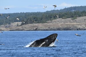As we bid adieu to summer, and as I write this on the fall equinox, I have definitely noticed that our trips out on the water this past week have felt a little different. The morning and the late afternoon air is chilly, and before we’re done cleaning up from our evening trips out, it’s dark. It’s been an unbelievable summer season and we’re still delighting in the whales and wildlife that are here for all of the Salish Sea’s resources. The late-in-the-day, golden hour lighting that we experience in September brings its own magic and I’m very interested to see which humpbacks begin passing through the islands as they start their migrations south. It’s possible that some of the Bigg’s killer whale families we haven’t seen for several months may also make passes into our area.