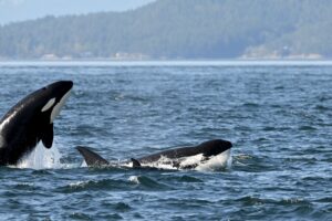 On a morning trip out with the T75Bs, we witnessed quite the spectacle. Post-prey sharing, the group’s energy was still running high. Two of the younger whales in the group T75B3 “Rubble” and T75B4 “Petra,” with mom’s instigation first, turned their sights and hunting prowess onto a couple young Common Murres. These recently fledged seabirds are currently flightless until they grow in their flight feathers, and so unfortunately are “sitting ducks” for young apex predators. Though the orcas very likely won’t consume them they will practice hunting techniques on them. It was sad for the birds but utterly amazing just how calculated, graceful, and relentless killer whales can be–practice or not. These two young whales seems to be off to a good start and I’m sure this practice will aid them in future hunts to support themselves, and possibly offspring of their own later down the line (at least where T75B4 is concerned; we do not yet know the sex for T75B3). Check out a couple photos photos at the bottom of this post where members of the T75Bs took to the air prior to those antics and then head over to our Instagram for more of the Common Murre play-by-play.
